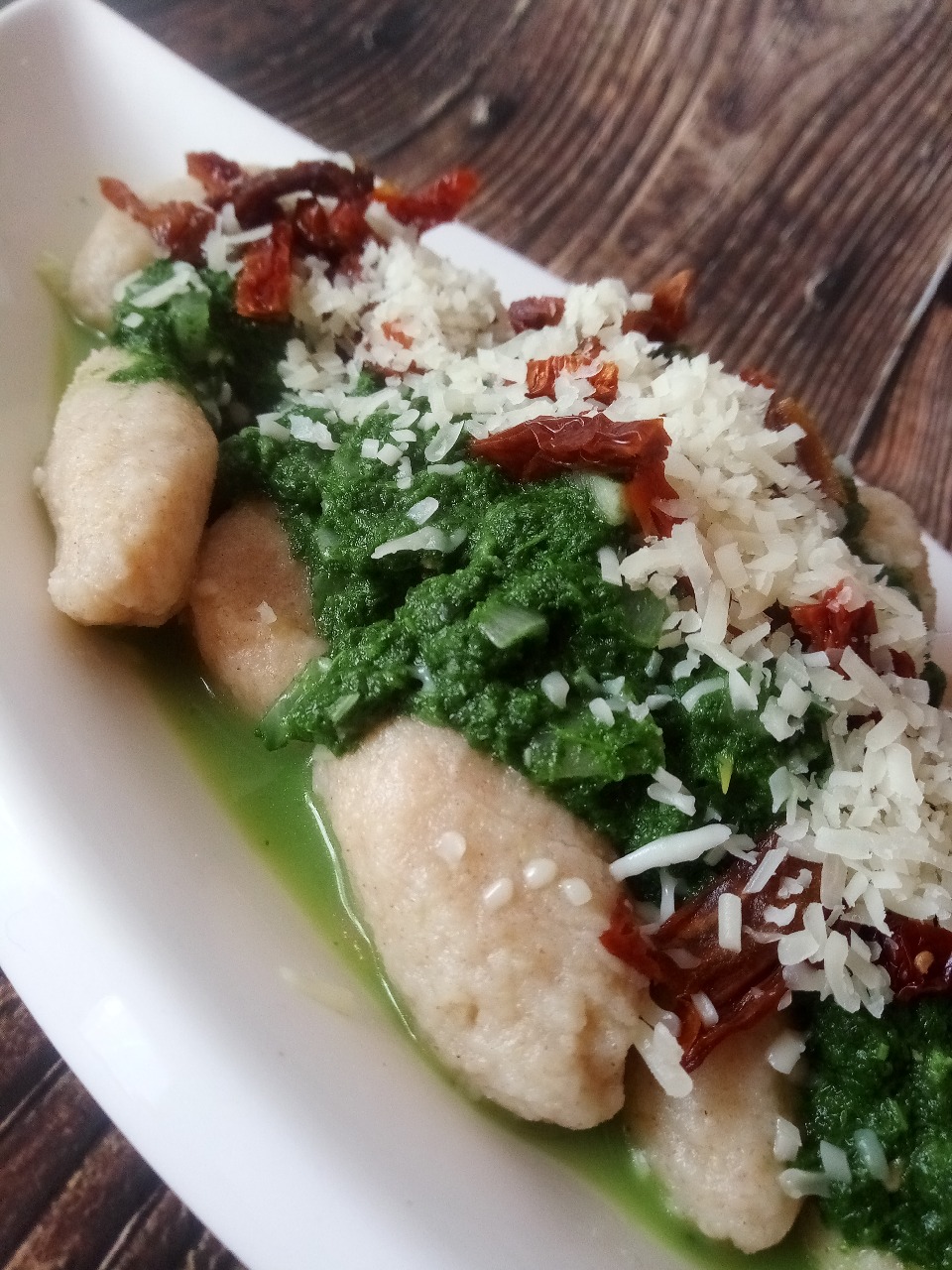 Záměrně tady nemám gramáž surovin, protože jsem to dělala od oka. Hodně brambor, dve vejce a půl na půl mouky. Noky nebudou úplně čistě žluté, protože jsou mouky tmavé. Tohle je zdravější verze. Kdo by chtěl, je možné nahradit mouky moukou hrubou, kukuřičnou, klasickou polohrubou i hladkou. Ale tam nechte těsto chvíli odležet, protože mouky obsahují lepek.